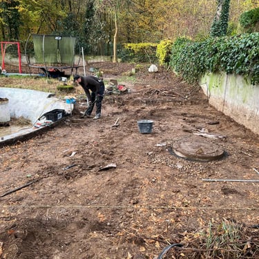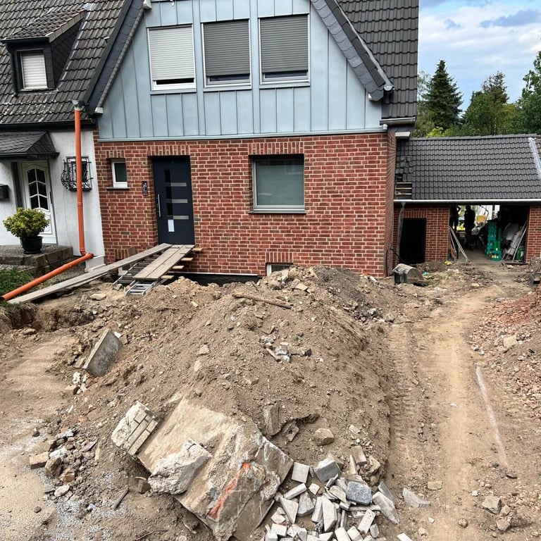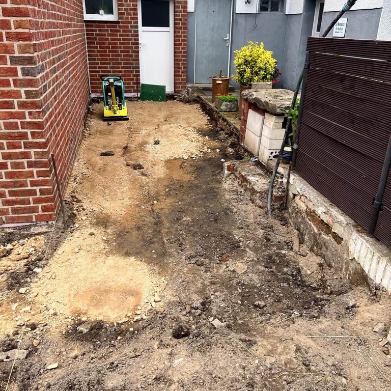 Bei diesem Projekt haben wir eine komplette Außenflächen-Gestaltung rund um ein Einfamilienhaus in Düsseldorf umgesetzt. Unsere Leistungen umfassten den Aushub, die Vorbereitung des Untergrunds, das Verlegen von Pflastersteinen, sowie den Bau einer modernen Terrasse mit Naturstein-Elementen.